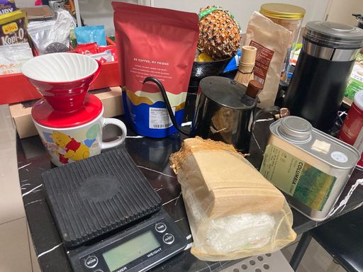 Our pouring setting. Everything except the coffee is less than 30 MYR. Got the kettle from Tzeyu's brother's friend.
